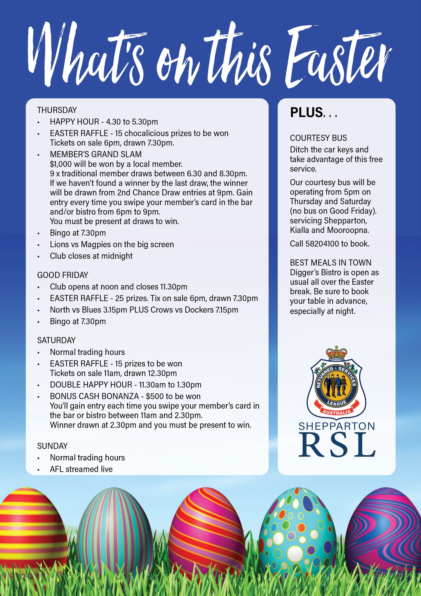 Happy Hours, Easter Raffles, Bingo, AFL on the big screen, Diggers Bistro and courtesy bus (bookings recommended).